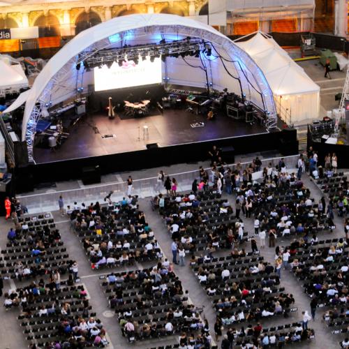 Proprio il pregio del contesto architettonico in cui si svolgono i concerti ha indotto VM&E a instaurare una partnership con Litec (brand di Staging Systems Europe Spa, che appartiene a Vitec Group Plc) leader nella fornitura del trussing e dei suoi accesori. Ciò ha permesso di allestire un palco dotato di una modernissima copertura denominata "Libera Alusfera", che con un arco e una copertura a quarto di sfera ha coperto tutta la superficie del palco. Una struttura con superficie bianca, che risaltava ancora di più grazie agli effetti illuminotecnici scelti dai singoli artisti e al megaschermo posizionato al suo centro. Una soluzione allestitiva che ha permesso di avere una struttura molto "leggera" e di impatto limitato, del tutto in linea con la tutela del contesto architettonico che la Piazza richiede.