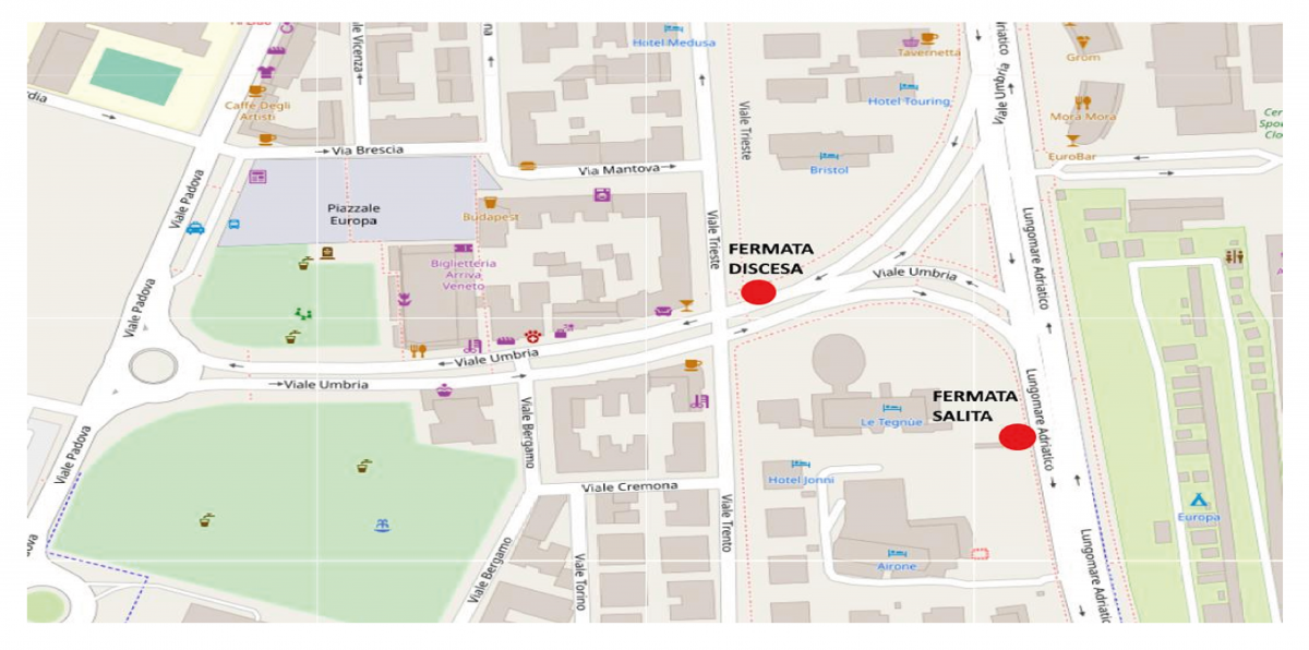 AVM/Actv informa che, dalle ore 8.00 di mercoledì 29 aprile 2026 e fino a nuova comunicazione, per lavori viene spostato il capolinea di p.le Europa in Lungomare Adriatico; pertanto le linee 81E – 82E in arrivo a p.le Europa effettuano ultima fermata di discesa alla fermata provvisoria in viale Umbria, per poi effettuare la ripartenza dal capolinea provvisorio di Lungomare Adriatico situato nei pressi della confluenza con viale Umbria.