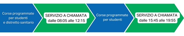 In periodo scolastico sono previste 2 fasce orarie di servizio a chiamata, una al mattino dalle 8:05 alle 12:15 e una al pomeriggio dalle 15:45 alle 19:55 in quanto, al di fuori di tali fasce, al fine di favorire l’utenza scolastica, vengono mantenute in esercizio le corse seguenti (che non necessitano quindi di prenotazione)